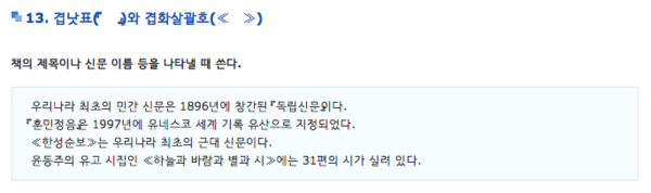 다음은 겹낫표와 겹화살괄호, 홑낫표와 홑화살괄호에 대한 내용을 보자.