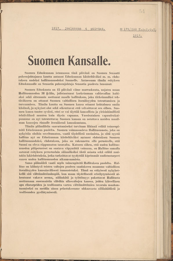 핀란드 원로원 의장 페르 에빈드 스빈후부드(Pehr Evind Svinhufvud, 1861년~1944년)가 독립 선언서를 낭독했으며 볼셰비키 지도자 블라디미르 레닌을 만나러 러시아 상트페테르부르크에 찾아갔다. 당시 러시아 제국에게 지배를 받던 여러 민족이 일제히 독립을 선언한 가운데 핀란드까지 붙들어둘 여력이 없었던 레닌은 마지못해 핀란드 독립을 승인했다.